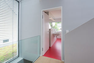 Die durch den Bebauungsplan limitierten Möglichkeiten galt es aufzubrechen, um einen differenzierten Baukörper zu schaffen. Eine vertikale Teilung des Hauses durch eine gläserne Fuge interpretiert die gewohnte Satteldachstruktur neu. Lufträume machen diese über alle Geschosse hinweg erlebbar, lenken das Licht und schaffen Blickverbindungen. Eine horizontal ausgerichtete, farblich abgesetzte Basis markiert den Eingangsbereich und bricht die Höhe.